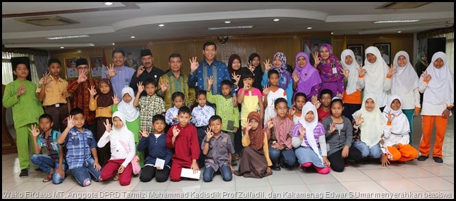 Sigapnews.com | Pekanbaru - Walikota Firdaus MT didampingi Anggota DPRD Tarmizi Muhammad, Kadis Pendidikan Prof Zulfadil, dan Kakamenag Edwar S Umar, menyerahkan beasiswa dari Baznas kepada 155 orang anak asuh, Kamis (25/9). Walikota Firdaus MT didampingi Anggota DPRD Tarmizi Muhammad, Kadis Pendidikan Prof Zulfadil, dan Kakamenag Edwar S Umar, memperagakan slogan salam tiga jari PAS bersama para anak asuh penerima beasiswa dari Baznas, dari pantuan wartawan sigapnews.com yang meliput acara berjalan dengan aman dan lancar.