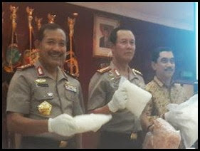 Sigapnews.com | Jakarta - Kapolri Jenderal Polisi Sutarman (dua dari kiri) memegang barang bukti shabu sebanyak 71,5 kg atau senilai Rp 143 miliar saat digelar di ruang Rupatama Mabes Polri (10 Oktober 2014).
