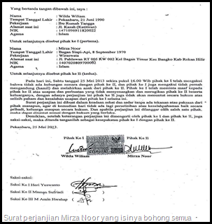 Saat ditanya kenapa Wilda menanda tangani surat perjanjian tersebut. Wilda menjawab, �pada waktu itu, saya tanda tangani kertasnya masih kosong bang. trus saya dipaksa oleh Heri Susanto (paman Wilda), untuk menanda tangani surat tersebut. kalau tidak saya tanda tangan, nanti susah katanya (Heri susanto red) karena Mirza Noor orang hebat dan anak Gubernur Riau (H Annas Maamun)�, terang Wilda.