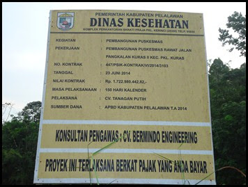 Sigapnews.com | Pelalawan - Berdasarkan pantauan wartawan dilapangan, Kamis (23/10/14) bahwa, Pemerintah Kabupaten Pelalawan telah mengalokasikan dana APBD tahun anggaran 2014 untuk pembangunan puskesmas rawat jalan di Pangkalan Kuras II Kecamatan Pangkalan Kuras Kabupaten Pelalawan, namun pengalokasikan dana tersebut sudah tidak sesuai dengan yang di harapkan oleh Pemerintah Kabupaten Pelalawan.