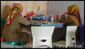 Selasa (21/10/2014) tepat diwarung dekat sekolah Bernas Pangkalan Kerinci, terpergok dua orang pegawai yang tengah duduk santai pada jam kerja. Kedua PNS itu, langsung membalikkan badan seperti tidak suka melihat awak media karena takut dijapret wartawan atas mangkirnya mereka pada jam kerja.