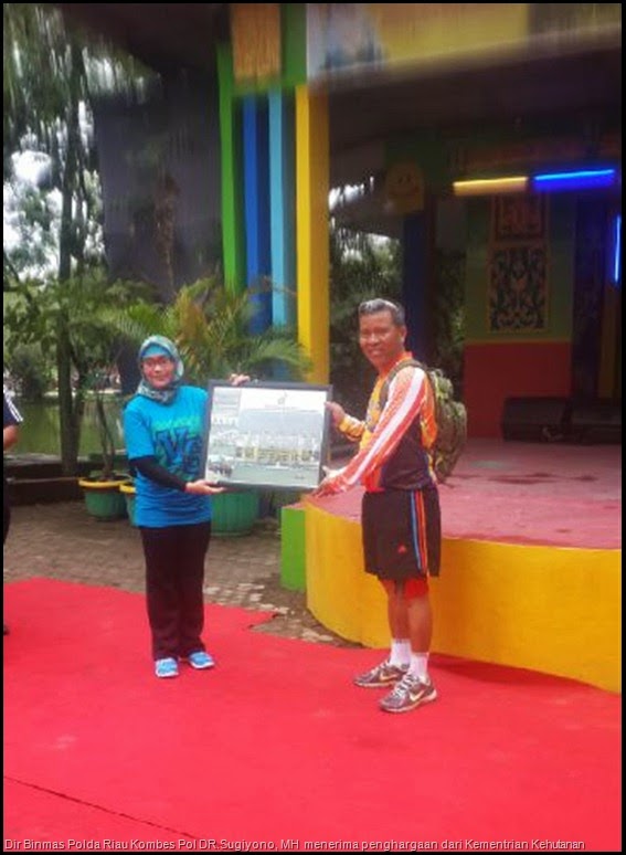 Sigapnews.com | Pekanbaru � Polisi Daerah (Polda) Riau melalui Direktorat Bimbingan Masyarakat (Dir Binmas) Polda Riau Kombes Pol DR.Sugiyono, MH memperoleh penghargaan dari Kementrian Kehutanan dalam ikut serta penanggulangan Karhutla berbasis masyarakat dengan menyebarkan maklumat Kapolda Riau tentang larangan membakar lahan dan hutan 200 ribu eksemplar dan banner dibagikan kepada masyarakat dan cuap � cuap pada komunitas dan radio � radio.
