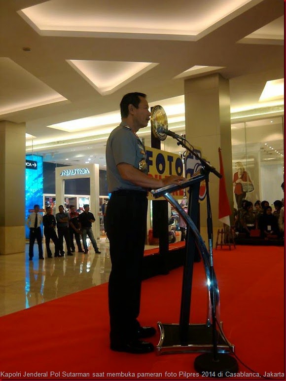 Sigapnews.com | Jakarta - Kepolisian Republik Indonesia menggelar Pameran Foto Pilpres 2014 di Mall Kota Casablanca, Jakarta. Pergelaran pameran dimaksud agar masyarakat bisa melihat berbagai dokumentasi kegiatan Polri dalam mengamankan Pilpres 2014. Foto-foto yang dipamerkan merupakan hasil karya masyarakat, jurnalis dan anggota Polri yang ikut berpartisipasi dalam Lomba Foto Pilpres 2014 yang diselenggarakan Polri bekerjasama dengan PPWI.