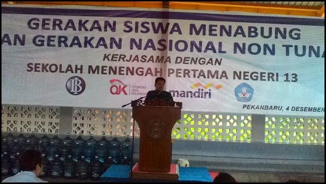 Sigapnews.com | Pekanbaru � Dalam rangka mensosialisasikan gerakan menabung dikalangan pelajar. Bank Indonesia (BI) bekerjasama dengan SMPN 13 Pekanbaru. Hadir pada acara ini Deputi kepala perwakilan BI Provinsi Riau Irwan Mulawarman, Asisten Direktur Kantor Perwakilan BI Riau Ahmad Subarkah, Slamet Mulyo BANK Mandiri, Kepala Bidang Pendidikan Dasar Dinas Pendidikan Kota Pekanbaru Drs. BUSTAMI, MM., Kasi Dikdas Drs. Syamsuddin, serta Majelis guru dan seluruh Siswa/i SMPN 13 Pekanbaru.Kegiatan ini dilaksanakan di Halaman sekolah , Kamis (4/12 )
