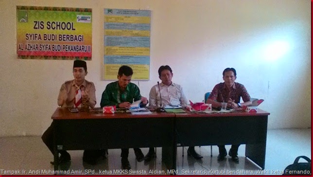 Peserta yang hadir ini adalah seluruh kepala sekolah Swasta Kota Pekanbaru yang berjumlah 70 Kepala sekolah Swasta. Dari pantauan wartawan sigapnews.com yang meliput acara ini berlangsung dengan antusias, aman,tertib dan lancar,hal ini nampak dari respon dari peserta yang hadir.Hadir pada acara diskusi bersama kali ini adalah. Ir. Andi Muhammad Amir, SPd., ketua MKKS Swasta, Aldian, MPd. Sekretaris, Kurtubi bendahara, Wakil ketua Fernando, MPd.