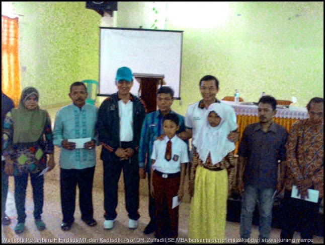 Kepala Dinas Pendidikan Kota Pekanbaru Prof.DR. Zulfadil,SE,MBA. Mengatakan, �pada bulan ini kita telah menyalurkan zakat sebesar 750 ribu per siswa SD SeKota Pekanbaru jumlah siswa yang mendapat bantuan zakat berjumlah 489 orang anak sekolah, termasuk 50 orang diantaranya penjaga sekolah. Sejak dicanangkan oleh Walikota Pekanbaru program berzakat bulan januari 2013 baru bulan juli 2013 kita dinas pendidikan melakukan serta kita salurkan pada anak kita atau siswa yang kurang mampu. Insya Allah bulan depan yaitu bulan januari 2015, kita dinas pendidikan akan lebih banyak lagi untuk memberikan zakat, dan bergiliran untuk bulan depan Insya Allah bulan januari nanti kita akan menyalurkan bantuan pada siswa/ i tingkat SMP,� jar Kepala Dinas Pendidikan Kota Pekanbaru Prof.DR. Zulfadil,SE,MBA.