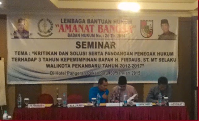 Sigapnews.com | Pekanbaru - LBH Amanat Bangsa yang diketuai oleh Ir.Yusrizal Tanjung, SH, mengadakan seminar yang SEeminar Kritikan, Solusi Serta Pandangan Terhadap 3 Tahun Kepemimpinan H. Firdaus,ST,MT. Seminar yang dimulai pukul 14.00 ( jam 2 siang ) bertempat di Hotel Pangeran. Jumat ( 31/1/2015 ).
