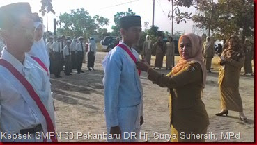 Kepala Sekolah SMP Negeri 33 Pekanbaru DR Hj. Surya Suhersih, MPd mengatakan bahwa pertama tama saya ucapkan banyak terima kasih kepada Pengawas di lingkungan dinas pendidikan Bapak Mirza Adrianus yang datang pada acara di sekolah kami sekaligus beliau jadi inspektur upacara di sekolah kami dan ikut menyaksikan pelantikan duta lingkungan. Selanjutnya